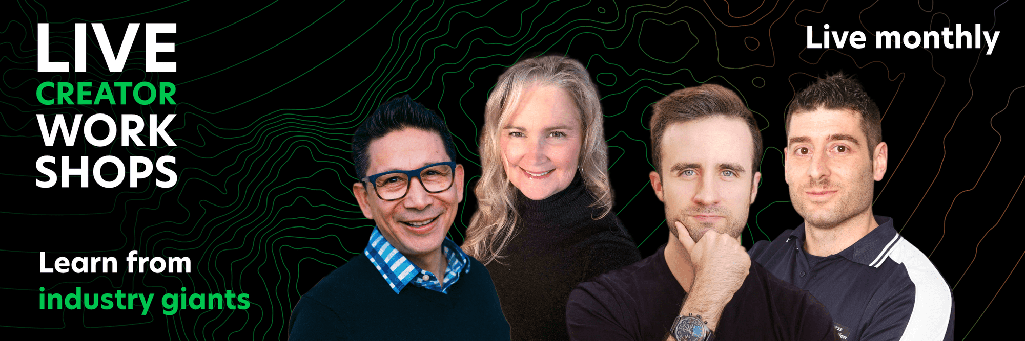 The workshops are 100% live so you can directly connect with the creator and ask them your questions! Join the monthly live workshop or watch the recording of past events.